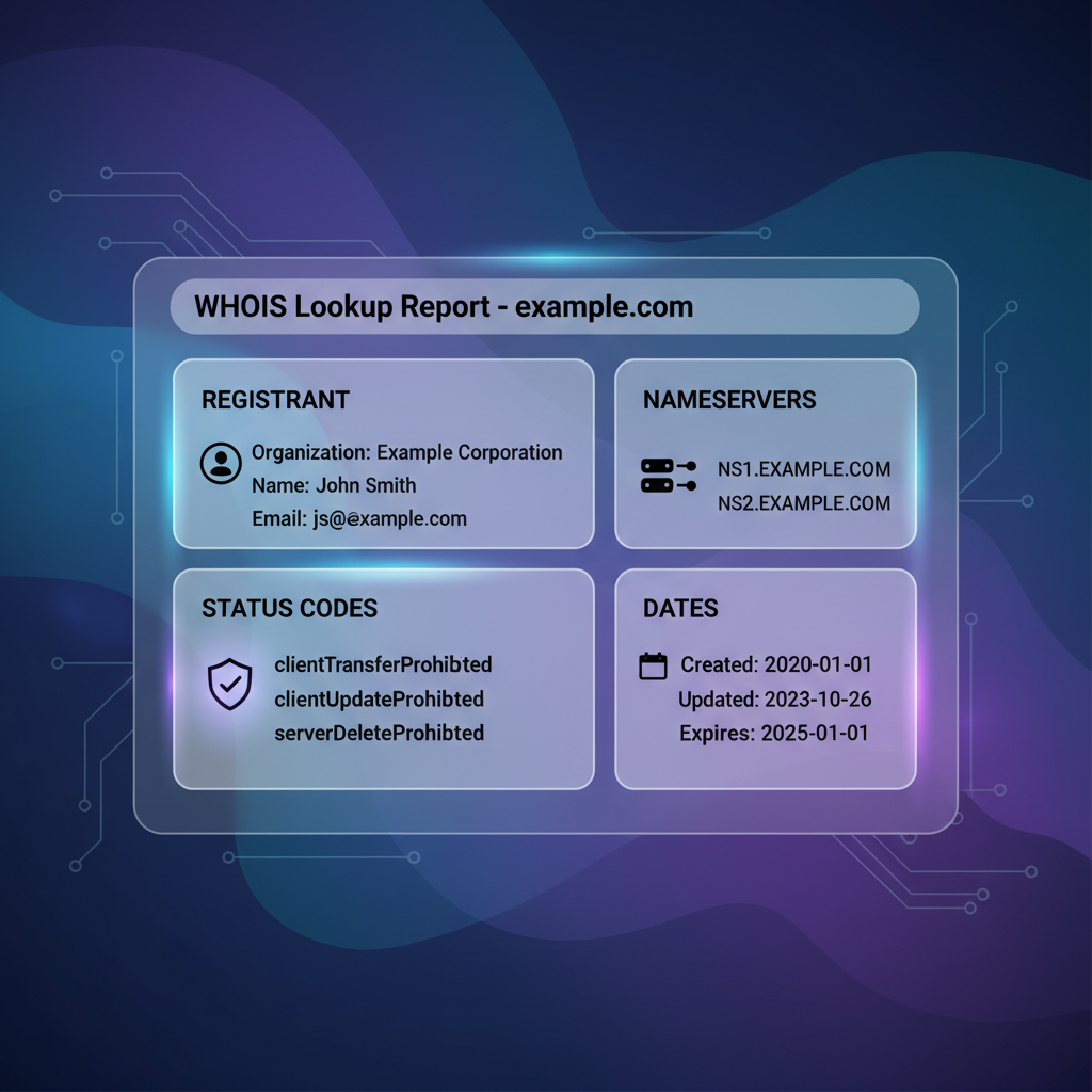 • WHOIS protocol reveals extensive registered domain metadata by default: Standard WHOIS queries typically yield registrant identity details (name, postal address, email, and phone), registrar and registry identifiers, domain status flags (e.g., clientHold, serverDeleteProhibited), and critical timestamps (creation, renewal, expiration dates). These data points directly influence system data models, access control logic, and verification procedures in domain-related services.